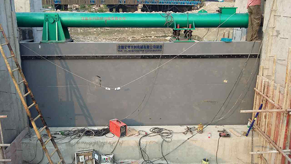 先把下層?xùn)朋w(鏈條、齒耙組合)供應(yīng)商鋼壩閘門用汽車吊起來(lái)并運(yùn)送到孔中,通過(guò)在上游對(duì)柵欄體施加一定的水平力,使其與鉛垂垂面傾斜15°,沿著軌道下降,通過(guò)清洗機(jī)鎖定了鎖定裝置。